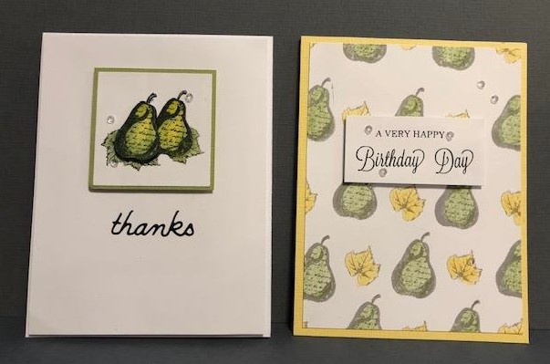 ReplyDeleteBoth cards are wonderful Skye! LOVE your CAS thank you card...the eye is drawn right into that lovely pair of pears! And your birthday card with the all over pear print is just as lovely too! Thanks so much for playing along with us at The Twofer Challenge!! :0)